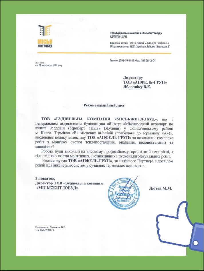Получили рекомендательное письмо от ООО "Горжилстрой", объект Международный аэропорт "Киев" (Жуляны)