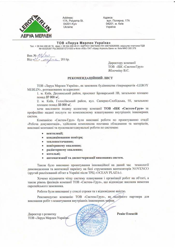 Группа компаний ApfelGroup выполнила для французской сети строительных гипермаркетов LEROY MERLIN комплексное устройство инженерных систем в трех строительных гипермаркетах в г. Киеве (Polyarnaya, Saperka, Brovarskoy).