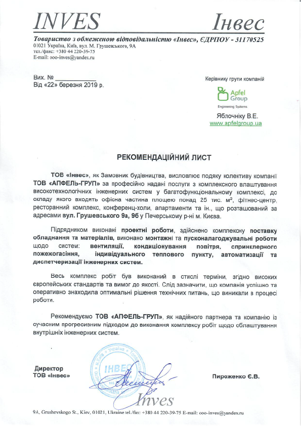 Директор ТОВ "Инвес" Пироженко Е.В.